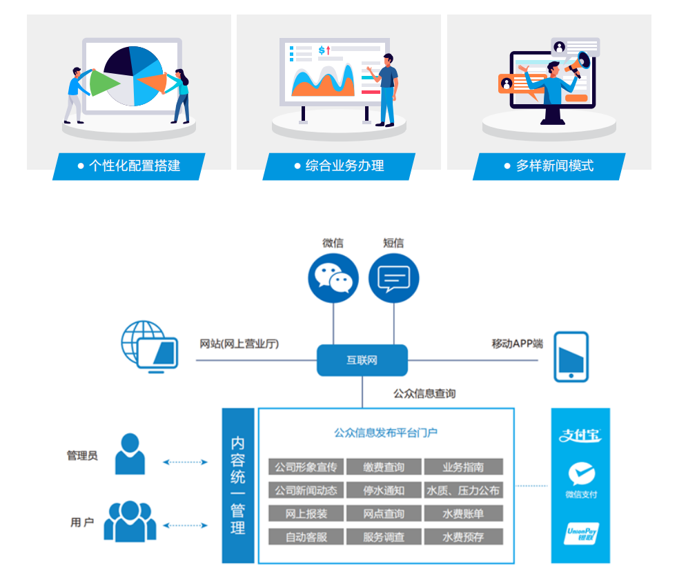 企业信息门户作为企业与群众沟通的桥梁,承担着群众在线进行业务办理、展示水司服务形象的作用。通过灵活的管理后台可以自定义官网门户模块内容,快速新增、搭建公告内容模块,快速编辑新闻公告、发布停水信息,方便扩展业务申请模块,实现多端兼容。通过多样的信息内容,服务模式致力打造全面、灵活、弹性的企业官网,优化企业营商环境。