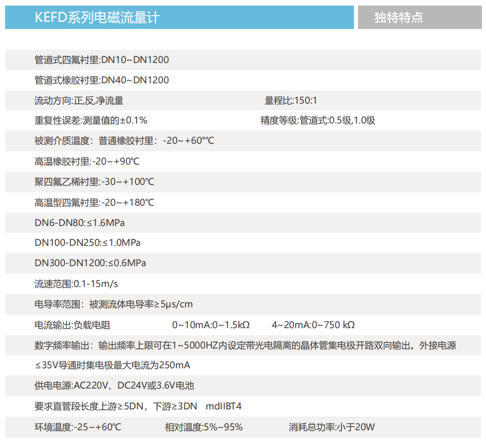 KEFD系列电磁式水表是华体会官方版网站登录入口专门 针对水司工商业用户贸易计量和小区考核的 应用特点设计的,高R值(R160-400),极低 始动流速(5mm/s),高精度(1、2级),绝对 不会出现卡表现象,不会出现由于磨损引起 的精度下降,表体长度与水表一直可直接代 替机械水表,可协助水司降低产销差和提高 工作效率。