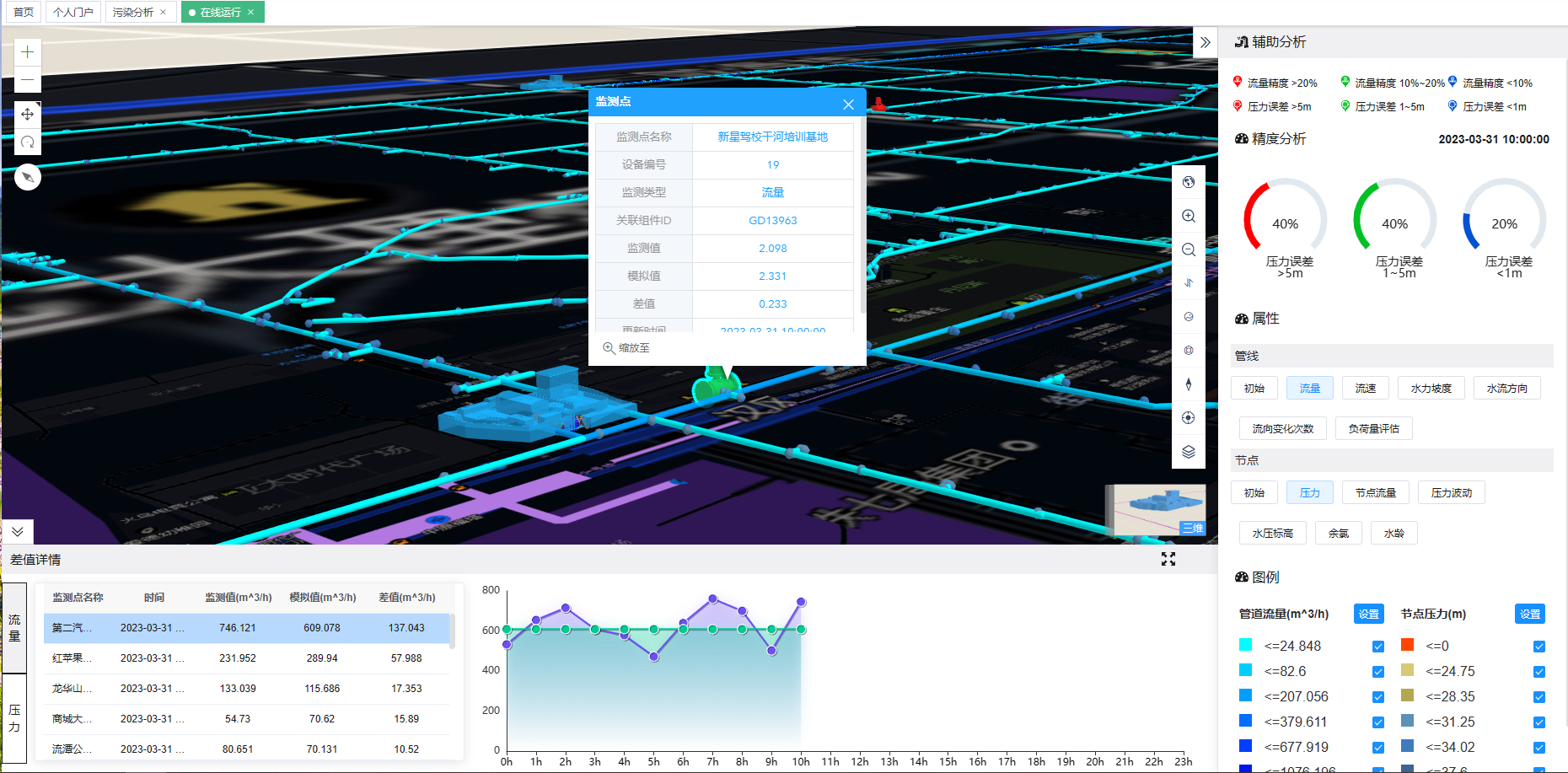 在线水力模型系统综合了GIS系统的静态信息与SCADA、营收等动态信息,并结合用水量的预测、估算与分配,按水力学理论对城市供水管网进行水力建模与模拟计算,在线跟踪供水系统水力运行状态,实时计算模拟出所有管道的流量、压降、流速和水厂、用户节点的压力等水力信息,为供水系统科学调度与管理提供依据。并根据实时的数据,自动校验模型,实现进行模型分析与日常管理一体化。