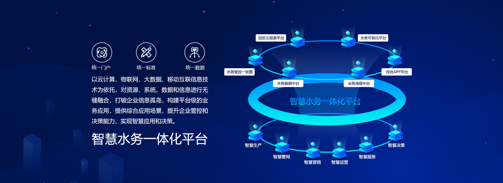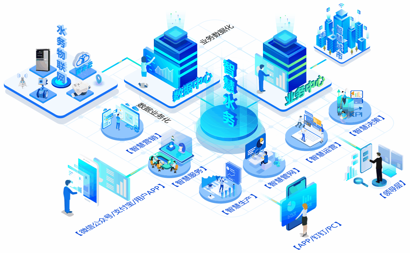 基于水务数字底座,构建以智慧水务为中心的综合运营管理平台。