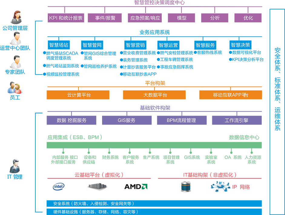 构建基于云计算、大数据,GIS、物联网的智慧燃气管控一体化平台,是服务于燃气企业战略目标,打造“智慧、低碳、绿色、环保”现代燃气企业的必有之路。以新一代信息技术为手段、融合行业先进管理模式、充分挖掘数据价值;通过燃气业务系统的控制智能化、数据资源化、管理精准化、决策智慧化、以保障燃气设施安全运行,达成燃气业务的更高效运行、更科学的管理和更优质的服务。