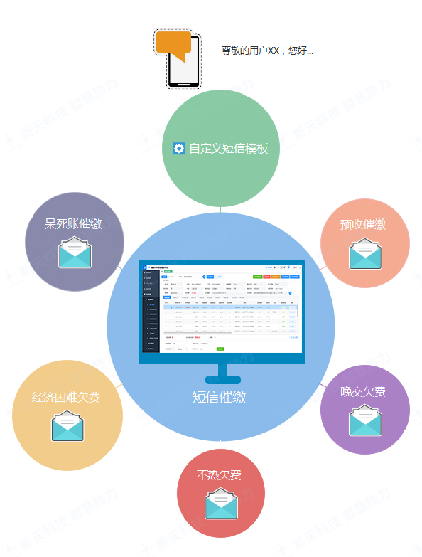为确保每个供热年度/每月热费回收工作的顺利完成,短信催缴系统为供热企业提供了更便捷更人性化的短信催缴功能,企业可自定义短信模板。工作人员可以根据不同性质的客户,采取不同的催费措施,如短信催缴、电话催缴、上门催缴,使热费回收工作处于可控、能控、在控状态,最大限度地降低了热费回收风险,有效地提高了热费回收效率。短信催缴实现"早提醒、早催费、早通知",提高热费回收效率,降低人工成本,避免在催缴中发生一些不必要的冲突,用行动服务客户,构建热费回收的和谐环境。