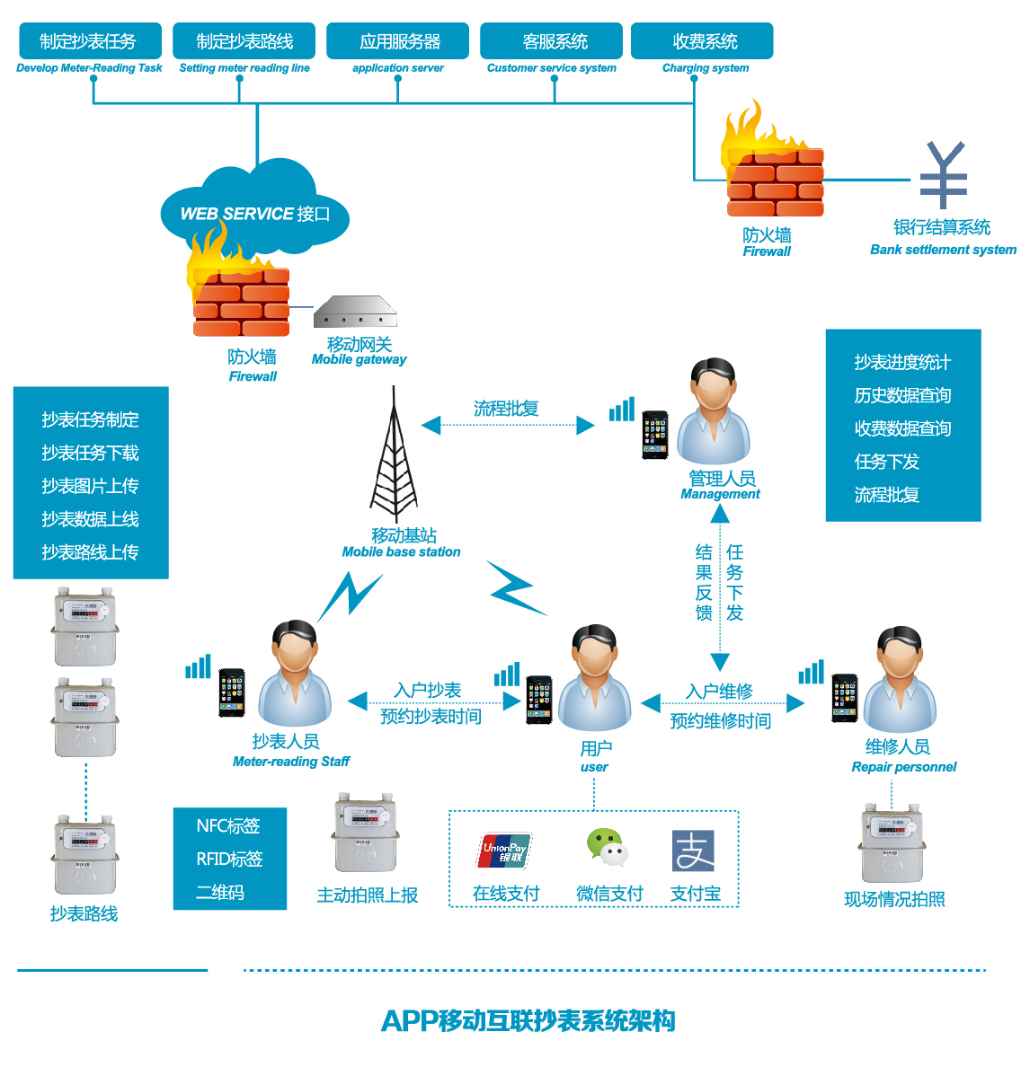 华体会官方版网站登录入口结合移动互联网、云计算及物联网技术,通过在智能手机上安装APP移动互联抄表系统应用,普通机械表上加装RFID标签,实现自动拍照抄表、抄表任务、抄表线路导航、抄表员业绩考核(实时位置,抄表路线)、计量表巡检、异常情况上报、客户短信预约通知、数据查询(欠费用户查询、用量查询、缴费记录查询)、现金收费、客户服务等业务处理,解决抄表员主观估抄漏抄、抄表业绩无法考核等问题,有效提升抄表员的抄表效率,大大缩短了抄表周期。