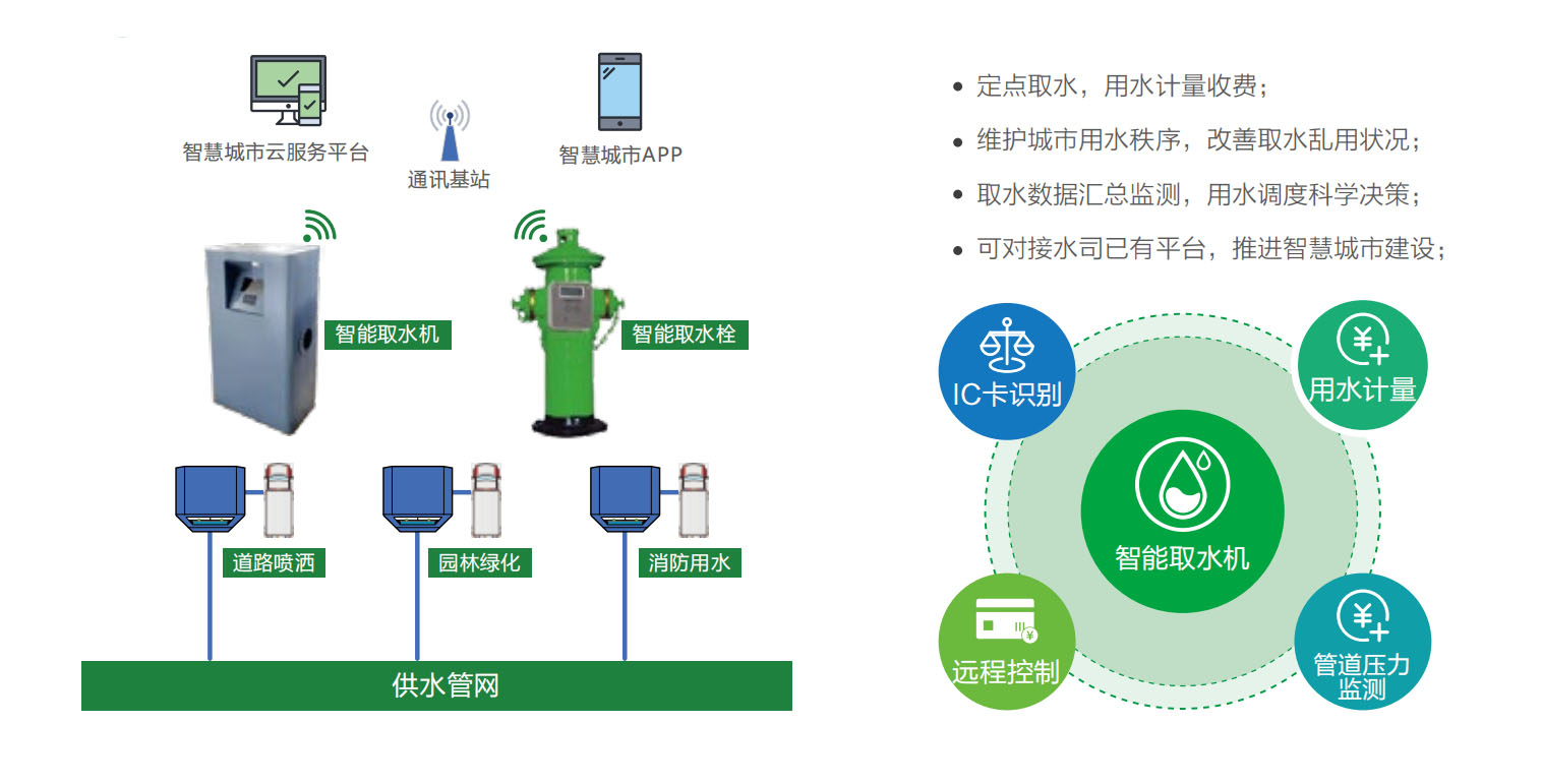 系统由智能取水机控制终端、电动阀门、计量水表、充电设备组成,集刷卡取水、远程控制、取水计量扣费、光伏供电功能于一体。通过云平台实时监测用户取水信息,采用IC卡、APP结合管控取水,规范城市园林绿化、道路喷洒、环卫等市政用水环境,实现城市用水精细化管理。